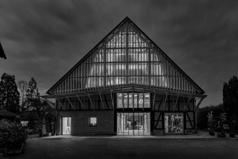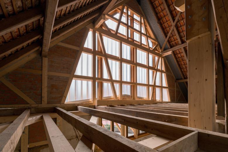 Beim Durchlaufen der Scheune überlagern sich enge und weite Räume sowie Licht und Schatten, wodurch jeweils unterschiedliche Raumqualitäten entstehen. An der Südfassade zum Haupteingang werden Felder im Fachwerk geöffnet, um Tageslicht ins Innere zu lassen. Tagsüber verstärkt der Lichteinfall die Raumwahrnehmung, da der gesamte Dachraum ausgeleuchtet wird. Bei Einbruch der Dunkelheit tritt die innere Struktur nach aussen und wird zum markanten Leuchtkörper für Passant*innen. In der grossen Dachfläche kann auf zusätzliche Öffnungen verzichtet werden.
