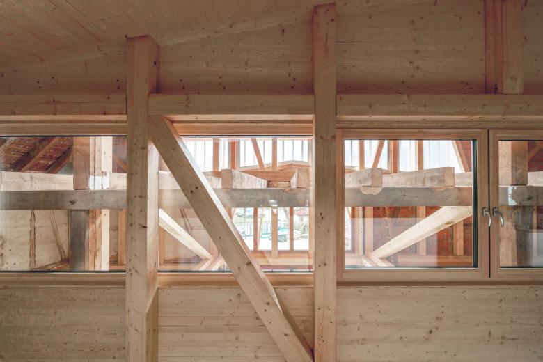 Die Reduktion beheizter Räume auf ein Minimum stellt eine einergieeffiziente und ressourcenschonende Lösung dar, die gezielt auf die Bedürfnisse der Bauherrschaft eingeht. Die vorhandenen Materialen Sandstein, Mauerwerk, und sichtbares Holzfachwerk prägen weiterhin den Innenraum. Neue raumbildende und statisch notwendige Bauteile bestehen aus Holz.