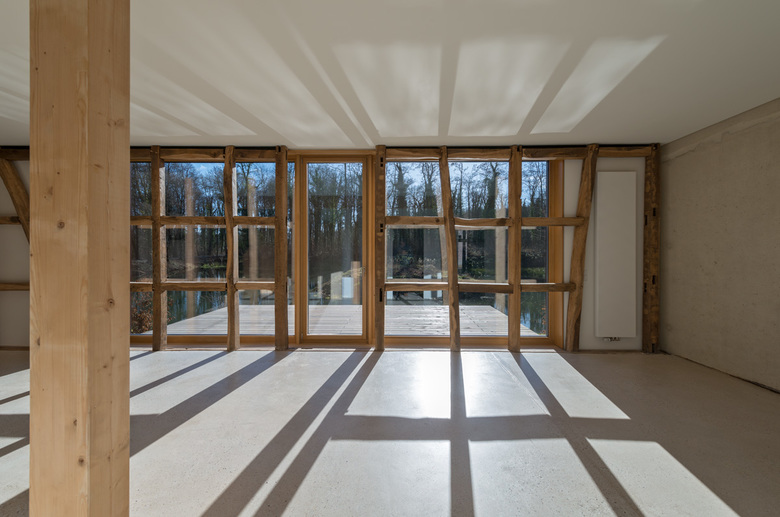 Nutzungs- und Umbaukonzept – In die in Dimension, Konstruktion und Erscheinung verschidenen Gebäude wurden sechs familienfreundliche Wohneinheiten unterschiedlicher Größe eingefügt. Jede der zweigeschossigen Wohnungen entwickelt eine eigene Atmosphäre. Der landschaftsprägende Charakter des „Vierkanthofes“ wurde durch Abbruch und bauliche Ergänzungen gestärkt. Die nun wieder klar zu Tage tretenden vier Hauptgebäude werden durch einen umlaufenden Sockel optisch und räumlich zusammengefasst, so dass die Anlage wie eine Insel inmitten des Landschaftsschutzgebietes liegt. Die seit langem trockengefallene Wasserfläche vor der Hofanlage wurde wieder zu einem Teich im historischen Umriss aufgestaut. Der gemeinschaftlich genutzte Hof dient der fußläufigen Erschließung der Wohnungen und fördert nachbarschaftliche Kontakte. Ergänzungen und Umbauten an und in den Gebäuden erfolgten im Sinne eines „pragmatisch-poetischen Weiterbauens“: Funktionierende Konstruktionen wurden genutzt und den neuen Anforderungen entsprechend repariert, ergänzt, in neue Konstruktionen integriert und nur wenn irreparabel zerstört, ersetzt. Gleichwohl bleibt auch das sperrige, krumme, abgenutzte Bauteil sichtbar, stellt sich schon einmal den eingesetzten neuen Materialien und Techniken entgegen und wird in Einzelfällen auch besonders hervorgehoben. Neue Konstruktionen und Bauverfahren sind selbstverständlich mit den bestehenden Strukturen verwoben und bleiben nachvollzeihbar. Aufgrund der sehr unterschiedlichen Grundkonstruktionen der Häuser, deren mannigfaltigen Schadensbildern und den vielfältigen energetischen und konservatorischen Anforderungen wurde für jedes Haus ein technisch-konstruktiv eigenständiges Umbaukonzept notwendig. Daraus entstanden differenzierte Raumgefüge und Detailausbildungen, die das individuelle Erscheinungsbild der Einzelhäuser prägen. Die Beschränkung auf wenige Materialien in allen Gebäuden trägt dazu bei, diese Heterogenität in ein harmonisches Zusammenspiel zu bringen. Die Reaktivierung des Feldhofes kann damit als exemplarisches Beispiel für das Zusammenwirken sehr unterschiedlicher Umgangsweisen mit Bausubstanz begriffen werden. Es ging beim Entwurf nicht primär um Erhaltung oder Erschaffung eines Bildes sondern um das Erfassen und Erforschen vorhandenen räumlichen Potentials und dessen Überführung in funktional, technisch und ästhetisch zeitgemäße Räume. Alle Häuser sind, obwohl denkmalgeschützt, als Energiesparhäuser konzipiert. Eine Holzpelletheizung in einem ehemaligen Wirtschaftsgebäude versorgt die Gebäude mit Wärme. Sämtliche Dach- und Freiflächen werden in den neu aufgestauten Teich entwässert. Die jetzt in Anspruch genommenen Grundflächen fallen trotz intensiverer Nutzung geringer aus, als dies vorher der Fall war. Das Projekt zeigt, daß Bauen auch ohne zusätzlichen Landschaftsverbrauch gelingen kann.