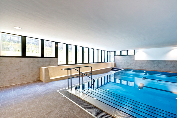 Die Bodenbeläge sind als Keramikplatten oder Schmutzschleusenteppich dunkel gehalten. Die Wände in den Nassbereichen wurden mit hellgrauen, grossformatigen Keramikplatten belegt, alle anderen Bereiche sind verputzt und Weiss gestrichen. Die zunehmende Helligkeit gegen die Decke lässt die Räume grösser wirken. Im Garderobenbereich wurde die Decke in einem Alustreckblech ausgeführt. Alle Leuchten und Lüftungsinstallationen sind hinter der Decke ausgeführt, was ein ruhiges Erscheinungsbild herstellt. Als wiederkehrende, dezente Farbe erscheinen die Schreinerarbeiten sowie die Innentüren in Naturfaser Schichtstoffplatten. Das Schwimmbecken ist nach neustem Stand der Technik in Chromstahl ausgeführt.