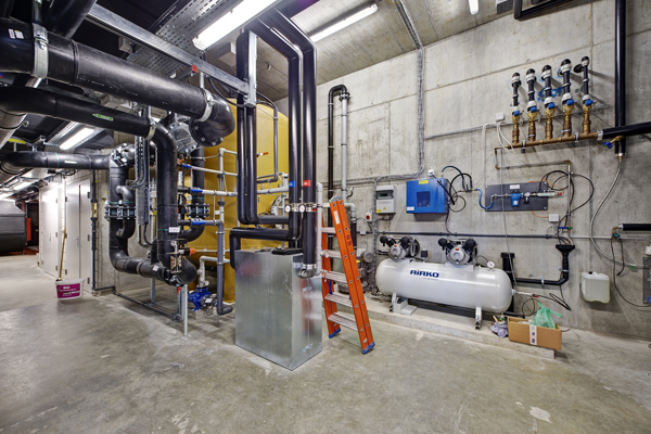 Der neue Raum für die Badtechnik wird im Untergeschoss erweitert und tritt somit nicht als neues Volumen in Erscheinung. Der Technikneubau schliesst auf die ganze Länge des Lehrschwimmbades an die Garderoben an. Mit dieser Massnahme werden der Betriebsablauf und die Einführung der Installationen in den Garderoben- und Badbereich optimiert. Zusätzliche Dämmungen der bestehenden Aussenwände und -decken und die neue Gebäudetechnik verbessern den Energiehaushalt des Bades deutlich. Die sorgfältig gestaltete Umgebung der Schulanlage ist nach Bauvollendung wieder hergestellt.