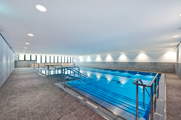 Der Zugang zur Schwimmanlage und zum Singsaal ist mit einem neuen Windfang aufgewertet. Grosszügige Oblichter führen das Tageslicht bis auf das Niveau der Schwimmanlage. Die Garderobenanlage ist komplett neu konzipiert. Die Nischenbildung der Garderoben und Duschen schützt dabei vor Einblicken. Nach dem Durchschreiten der Duschenzone tritt man in das neue Schwimmbad. Helle und zurückhaltende Oberflächen lassen den Raum grosszügiger erscheinen, insbesondere die glatte Akustikdecke unterstützt die Raumwirkung. Das einfache und klare Materialisierungskonzept vermittelt in den kleinen Raumzonen Ruhe und Grosszügigkeit.