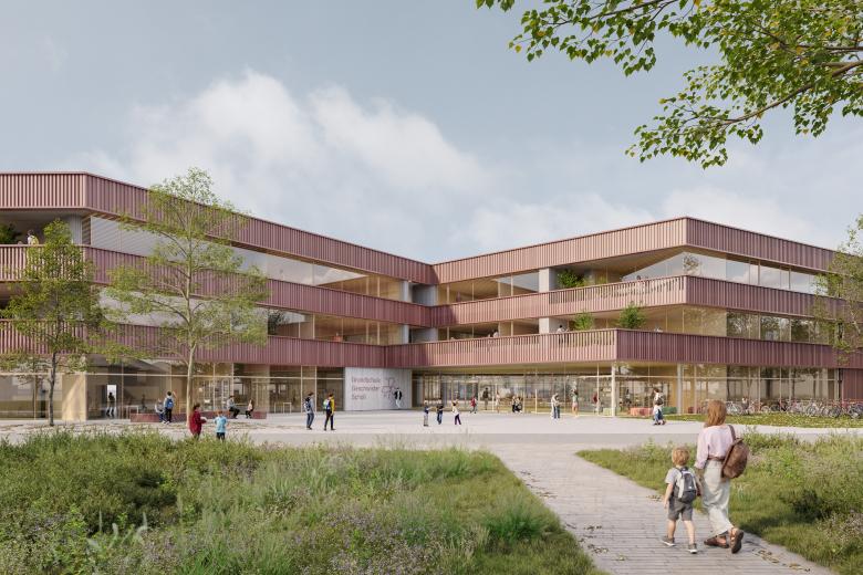 Die Schule wird als Holzbau geplant. Das Tragwerk besteht aus Stützen und Trägern aus Brettschichtholz. Decken und Wände werden aus vorgefertigten Holzelementen gefertigt, was für ein warmes Raumgefühl sorgt und kurze Bauzeiten ermöglicht.
