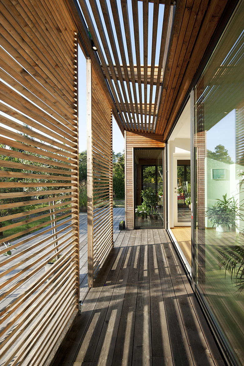 Höllviken south of Malmö was originally a seaside resort, but the forested rows of summer houses are continuously being transformed into a carpet of permanent housing. The site is a somewhat complicated corner lot with roads to the north and west.