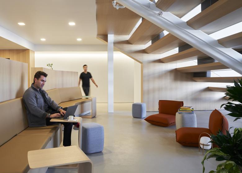Creating a connection to the outdoors was a critical design consideration for the campus experience and meditation environment of the Headspace culture. This was accomplished through a few design moves: exterior courtyard, bi-fold door and garage door to the courtyard, and the lightwell courtyard on the second floor.