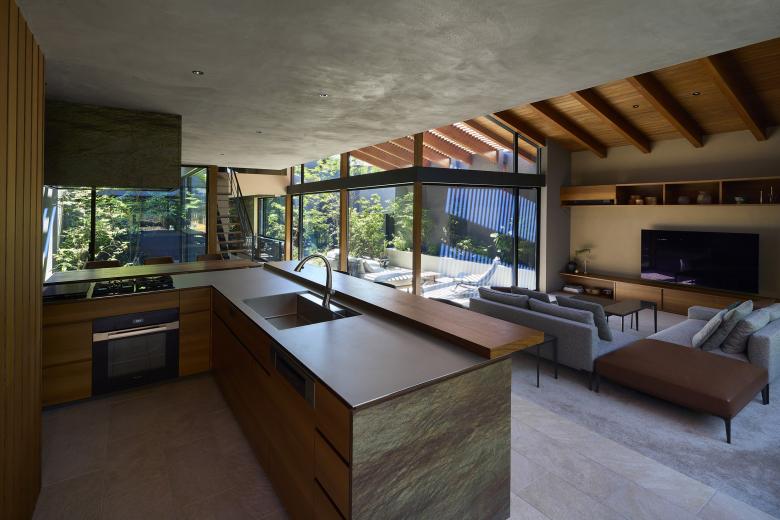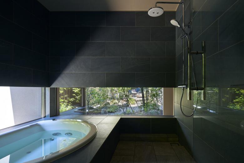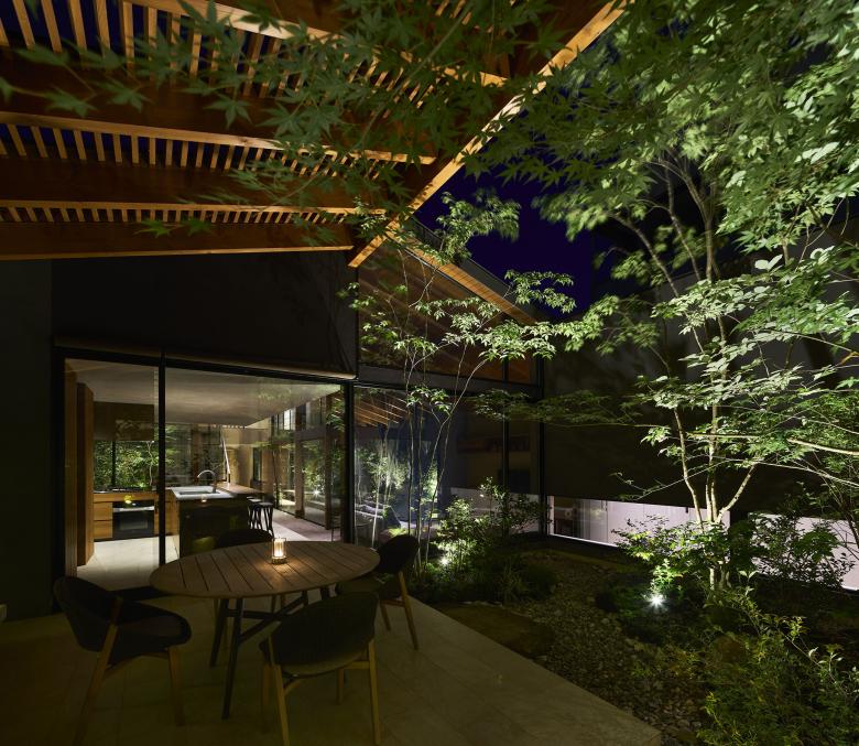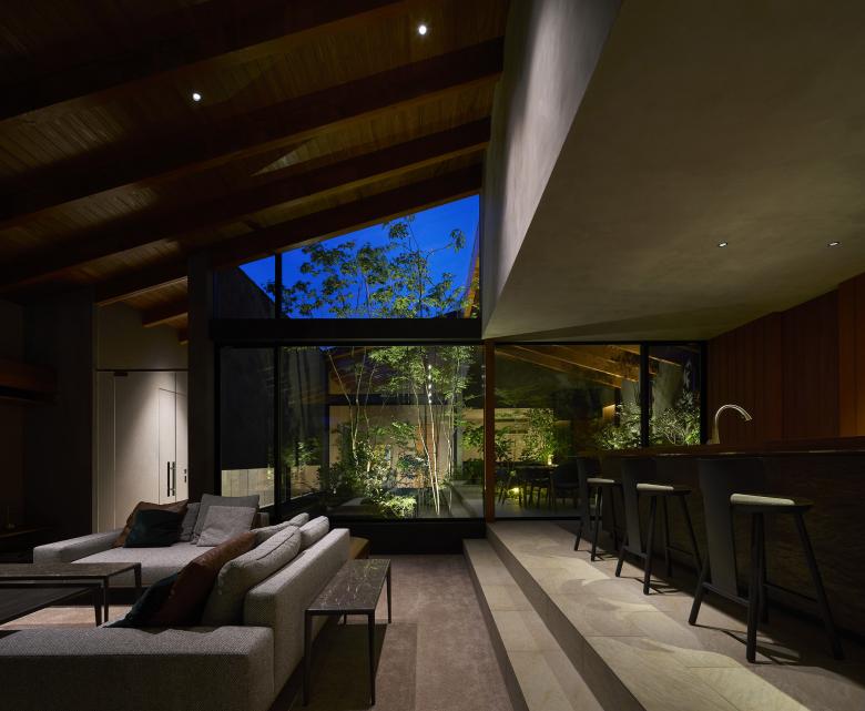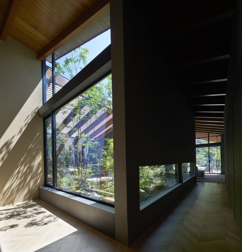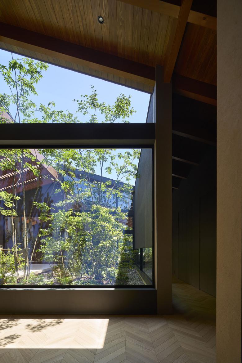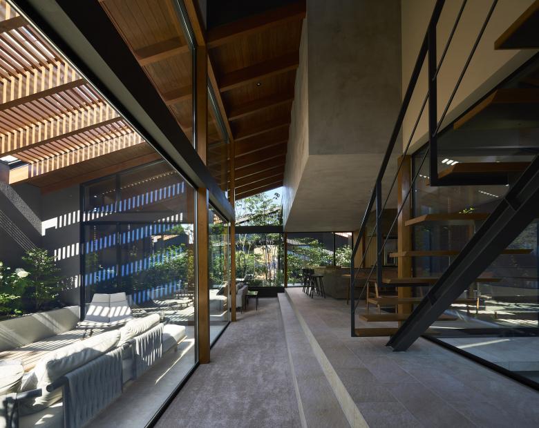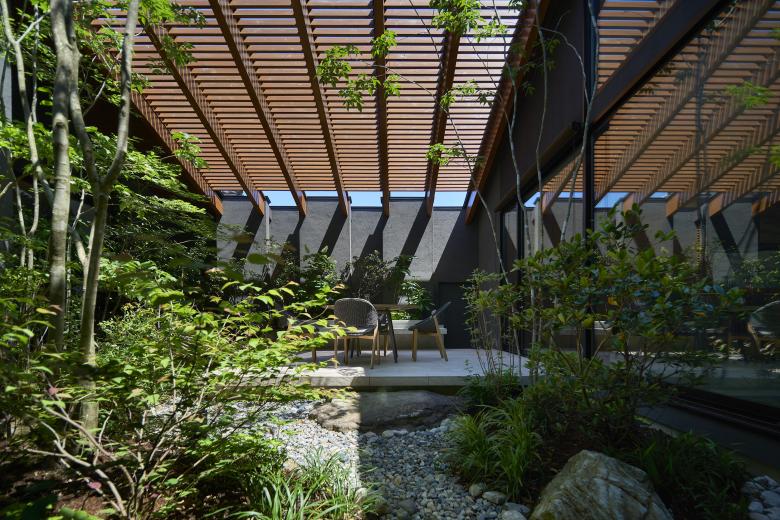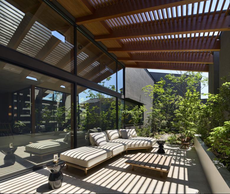 Each of the seven gardens is closely related to adjacent interior spaces and fulfills a distinct role depending on its location. The larger central courtyard and south garden accommodate an outdoor dining area and an outdoor living space, creating a gradational continuity between interior, intermediate, and exterior zones that lends depth to the overall spatial experience. Louvers softly filter views from the surroundings and mitigate direct sunlight, ensuring a comfortable outdoor environment.