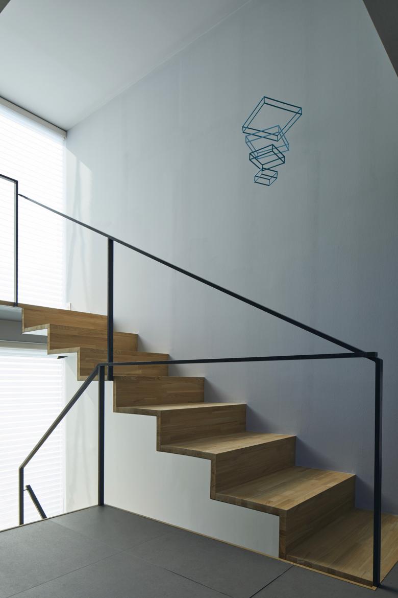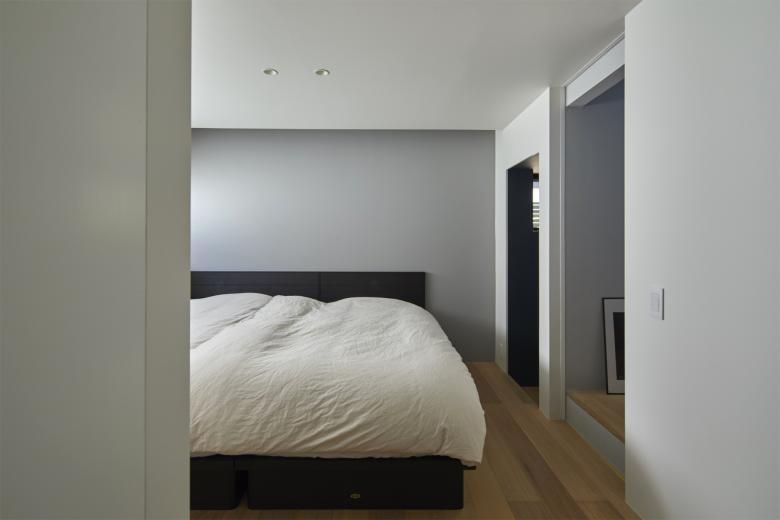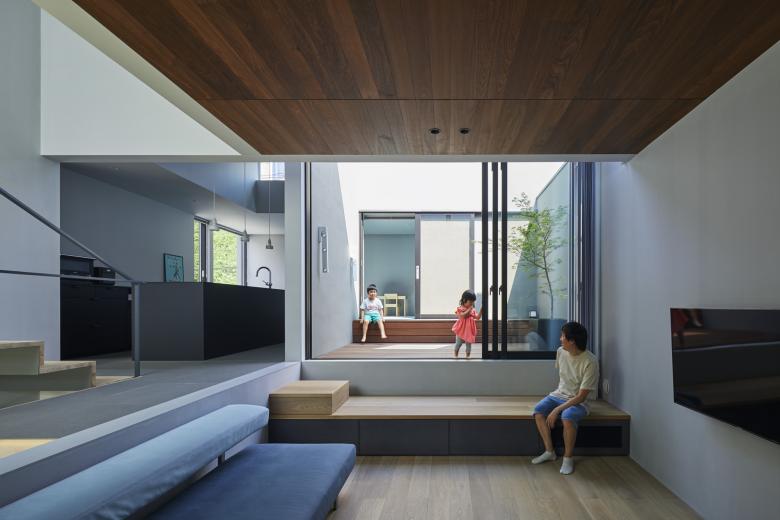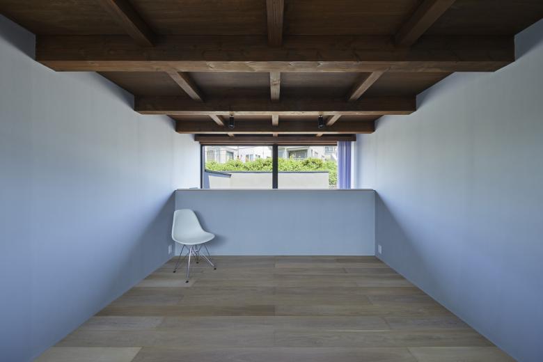 周辺の擁壁と造成地の合間を縫う坂道のように、内部では壁とスキップする床を縫い合わせる動線が立体的に折り畳まれ、一続きの内部空間が生まれた。移動するたびにフレーミングされた開口部から垣間見える高低差のある景色の展開により、内部と外部が連続する体験が生まれる。