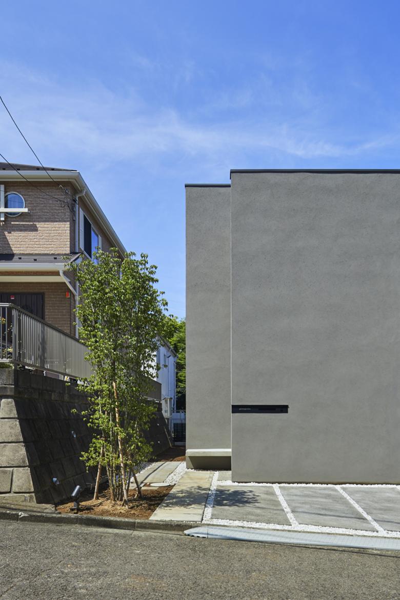 ここでは造成地に特有な高低差を伴った地形に対し、周辺の光や風、視線を制御するように外壁と屋根を立上げ、壁と壁の合間、屋根と屋根の合間に開口部を設ける構成とした。