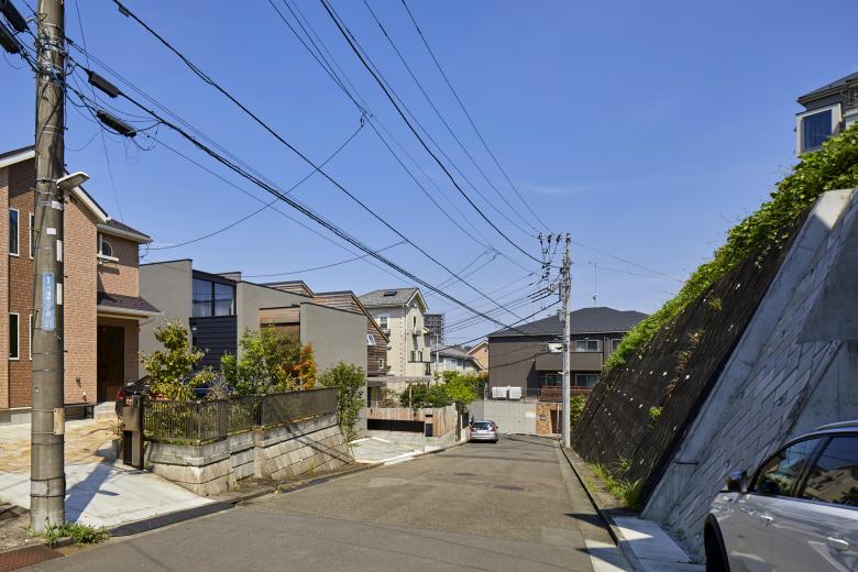 周辺は多摩丘陵の東端に位置し、丘陵と谷戸、高台と低地の狭間に沿って坂道が続く。