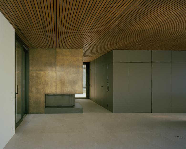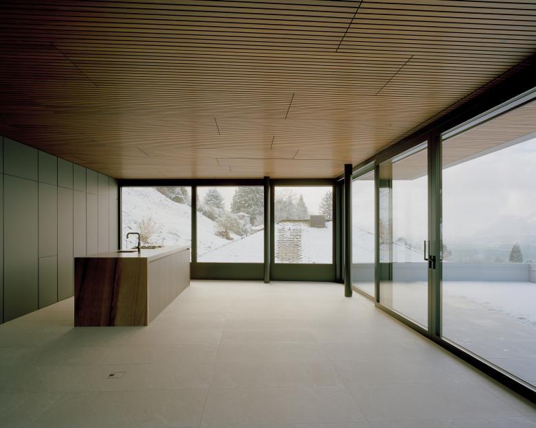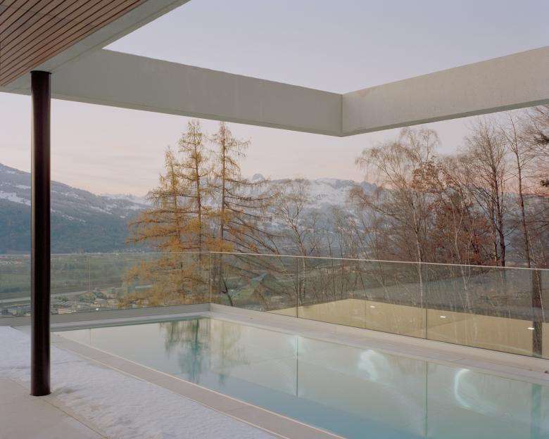 Ein besonderer Ort des Hauses ist der Poolbereich, der als wettergeschützter Aussenraum wirkt und das Thema „Wohnen im Freien“ auch in den Übergangszeiten stärkt. Das Zusammenspiel aus konstruktiver Präzision, reduzierten Details und einer ruhigen Materialwirkung prägt das fertige Gebäude und verleiht ihm eine zeitlose, sachliche Präsenz.