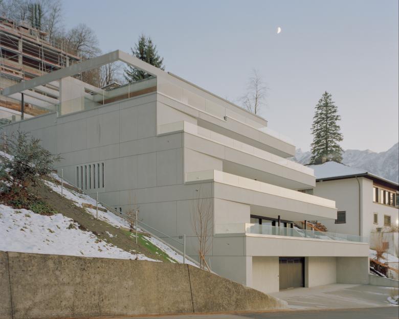 Haus Mazora ist ein präzise gegliederter Neubau in Hanglage realisiert. Der Baukörper entwickelt sich in klaren, horizontalen Schichten und reagiert damit direkt auf die Topografie: Rücksprünge und auskragende Ebenen staffeln das Volumen, reduzieren die wahrgenommene Höhe und erzeugen grosszügige Aussenräume mit hoher Aufenthaltsqualität.