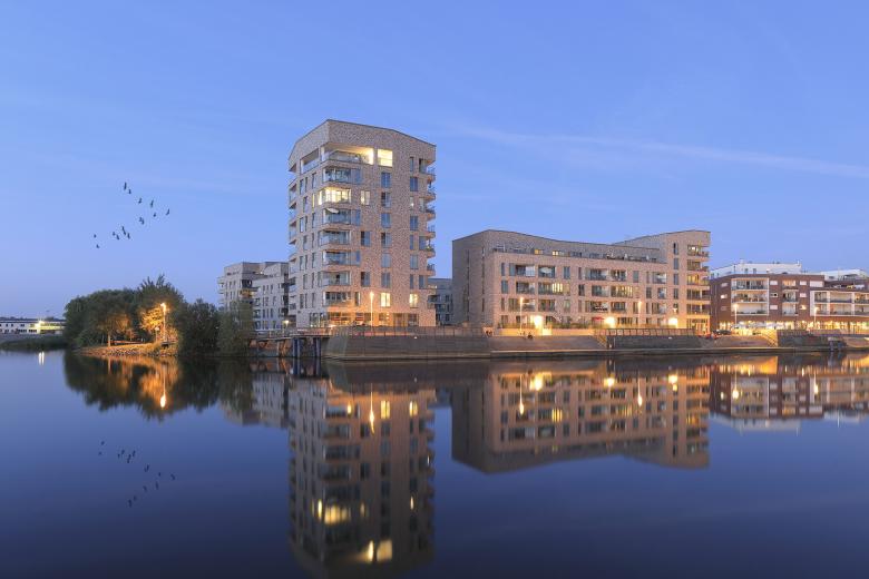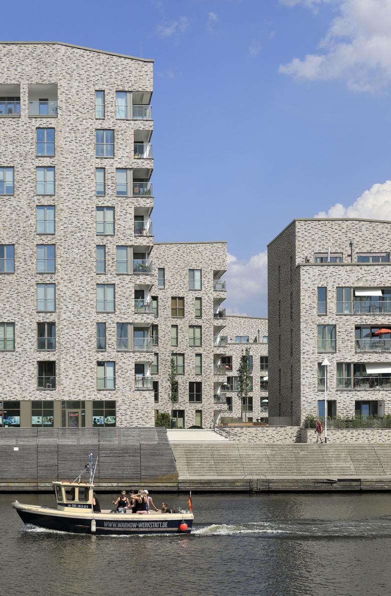Die Verbindung der Baukörper und Freiflächen ist durch die lockere Anordnung, die Mischung von Punkthäusern und die einfassende Blockstruktur harmonisch und abwechslungsreich zugleich. Das Ensemble ist mit einer Uferpromenade samt einer breiten Treppenanlage gesäumt, die den direkten Zugang zum Wasser erlaubt. Diverse Sitzgelegenheiten sowie Spiel- und Erholungsflächen tragen in hohem Maße zur Lebensqualität der Bewohner bei. Für eine einheitliche wie lebendige Wahrnehmung sorgen die Fassaden im traditionellen Gewand aus hellgrauem und beigem Klinker.
