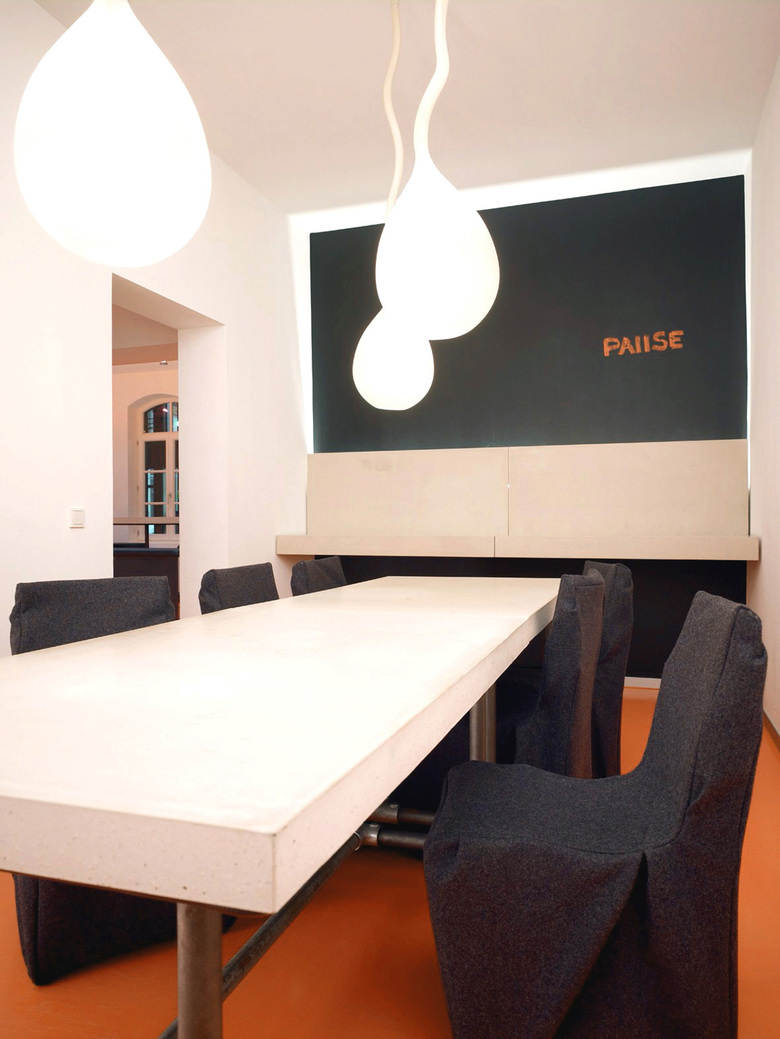 Traditionelle Materialien aus dem Bauwesen, wie Beton, geflammter Stahl oder Industriefilz werden für die Innenarchitektur umgewidmet und innovativen Produkten mit ungewohnten Eigenschaften entgegengesetzt. Es entstehen lebendige Räume mit einer schönen, selbstverständlichen Präsenz. Ihre langlebige Formensprache trägt ebenso wie die Verwendung durabler Materialien und die hohe Verarbeitungsqualität zur Nachhaltigkeit der Gestaltung bei. Ökonomischen und ökologischen Ansprüchen wird die Planung zudem durch lokale Produktionsstätten, kurze Transportwege und Möglichkeiten des Recyclings gerecht.