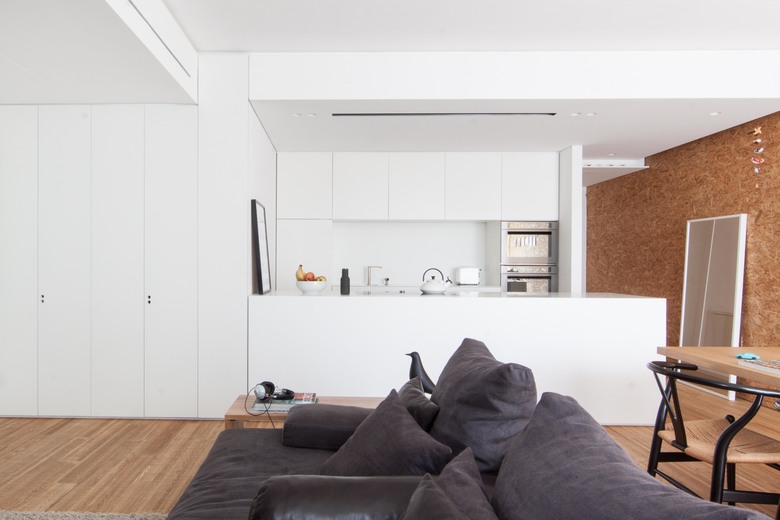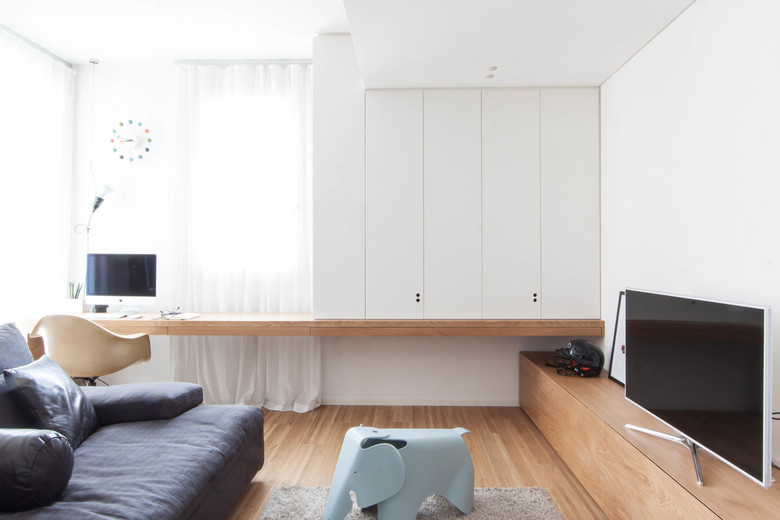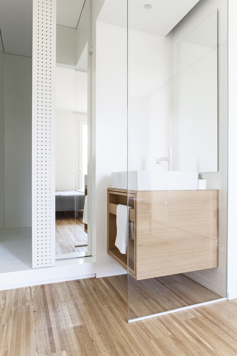 La rimodulazione spaziale ha interessato soprattutto gli ambienti di servizio, andando a riconfigurare la zona funzionale dedicata al bagno principale/lavanderia e aggiungendo un piccolo bagno di servizio annesso alla camera padronale. L’ambiente principale, che si affaccia sulla terrazza esterna, è composto da un open space in cui si sviluppa la zona soggiorno/cucina/studio e viene ampliato attraverso l’eliminazione di un corridoio di distribuzione.