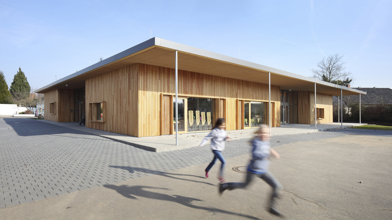Das Gebäude nimmt die Hauptrichtung und die Achsen des Schulgebäudes bzw. der Turnhalle auf. Der Baukörper ist als eingeschossiger, rechteckiger Baukörper mit Flachdach ausgebildet. Hauptmotiv ist dabei die große, auskragende Dachscheibe, unter der drei Holzboxen angeordnet sind. Diese enthalten vier multifunktionalen Gruppenräumen für die Ganztagsbetreuung sowie die Küche, zwei Mitarbeiterbüros und Nebenräume. Der zwischen den Boxen entstehende Zentralraum dient als multifunktionaler Speisesaal. Das Gebäude soll auch für schulische Nutzungen, insbesondere auch für Unterrichtszwecke genutzt werden.