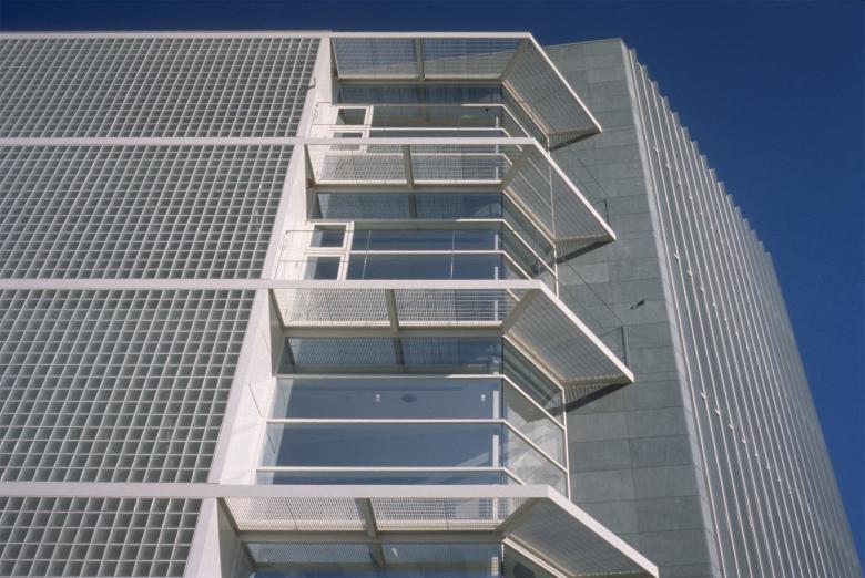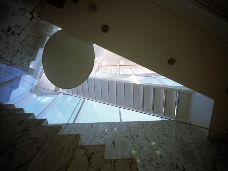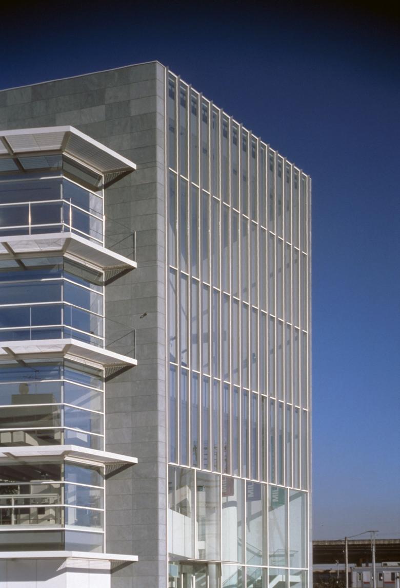 The plaza-facing facade was designed as a vertical glass screen to serve as a landmark for the station area. This section features a 13-meter-high atrium extending from the basement level, with stairs connecting three floors further emphasizing verticality. The city road-facing facade emphasizes horizontality through openings and balconies that create a sense of lateral expansion. The southwest corner features glass blocks, creating a bright, enclosed space within.