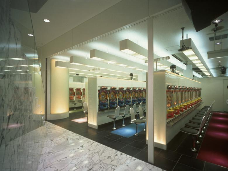 From the plaza, one can perceive the calm, subdued atmosphere created by the interior's white color scheme and indirect lighting through the glass screen. Together with its exterior, this design breaks away from the conventional image of pachinko parlors characterized by excessive colors and signage, proposing a refreshing pachinko parlor that is accepted by the local community.