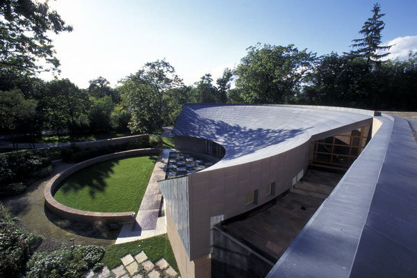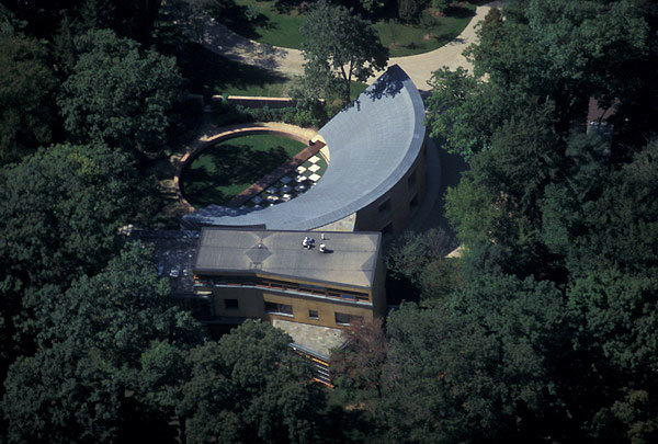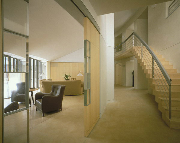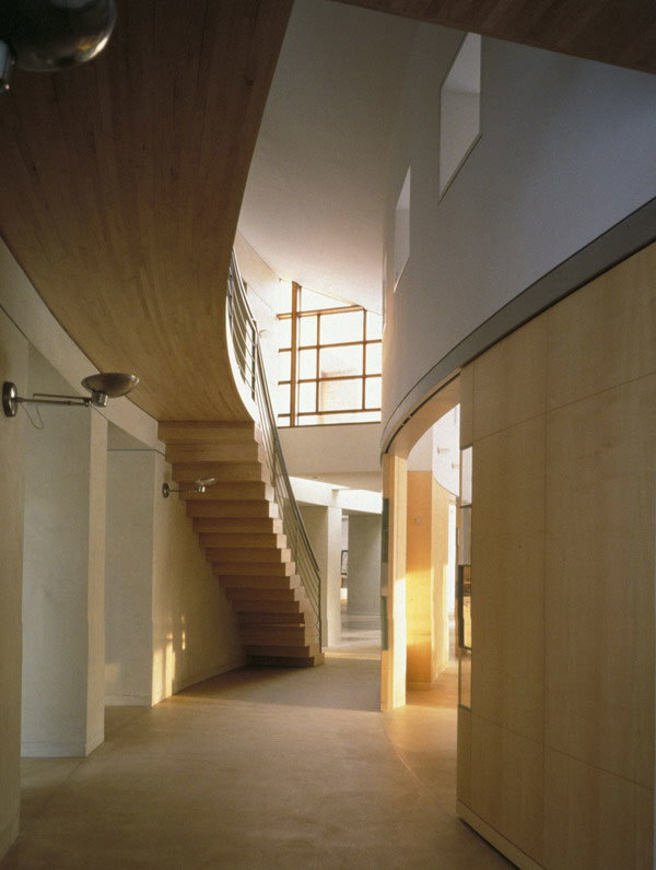 Situated on a bluff overlooking Lake Michigan, this design responds to the beauty and bluster of the lake by creating two worlds. One is oriented to the sunrise, water, and changing views of the lake, while the other is turned inward toward a courtyard that captures the warmth of the sun and provides a contrast to the severe lakefront weather. The strong forms of the house express the two worlds: its curved courtyard facade tears away from the glassed, three-story rectangle facing the lake. The important rooms - living room, dining room, family room, master bedroom, office and hallways - have exposure to both the courtyard and the lake. A three-foot-thick brick wall curves through the house, a modernist metaphor for the separation of the man-made from the natural.