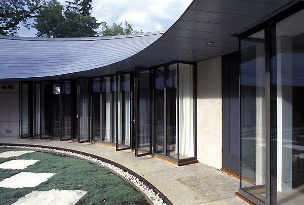 The house subverts the traditional suburban pattern, which presents the front yard, front facade, and garage to the street. Here, very little of the large house is visible to the community. The circular courtyard, separated from the street by a garden wall, replaces the normal open and unused front yard with a private exterior landscape. Cars enter from the side behind the curved brick wall that contains the garage, directly accessible to the house but out of sight.