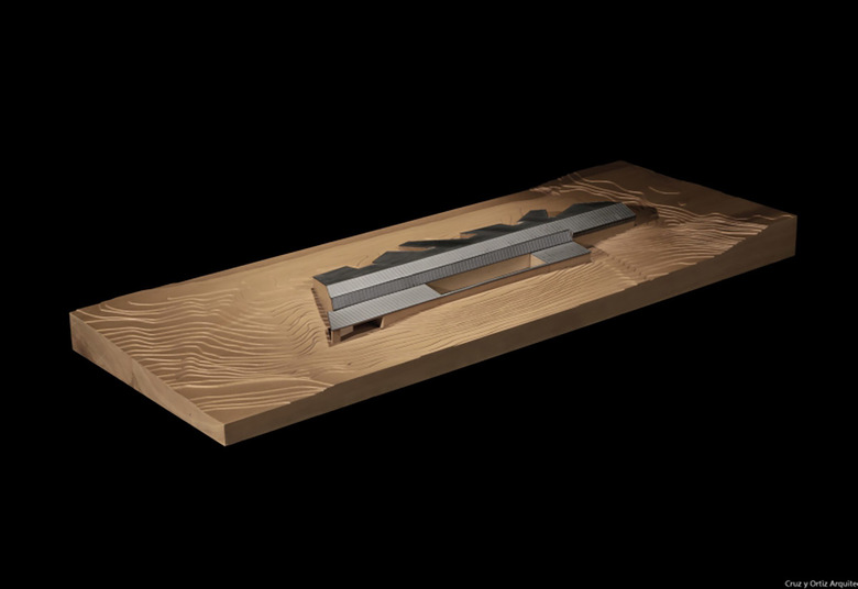 La diversidad funcional y formal de los distintos espacios que constituyen el Centro queda unificada por una cubierta que, con sus distintas pendientes, establece relaciones con el paisaje dunar circundante. La expresividad de la planta, al intersectarse con este plano inclinado, se manifiesta en la cubierta a través de una arista quebrada que dibuja el volumen del edificio.