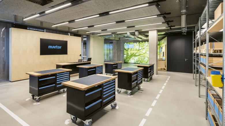 Die Nähe zum Kunden hat für MARTOR einen besonderen Stellenwert – so greift das Konzept die Ästhetik und Materialien aus dem Arbeitsumfeld auf, in dem die Sicherheitsmesser und -scheren zum Einsatz kommen: in den Werkshallen von Industrie, Logistik und Einzelhandel. Estrichboden und sichtbare Gebäudetechnik, ein transparenter Staplervorhang als Raumteiler, Leuchtstoffröhren, Gittertische, Werkbänke und Lagerregale zitieren die Kundenwelt und gehen in die Showroomgestaltung über.