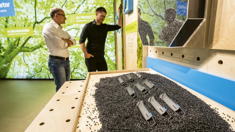 Marken- und Schulungsbereich sind über den Trendbereich verbunden. Dort werden in Wechselausstellungen verschiedene branchenrelevante Trends angesprochen. Aktuell zeigt MARTOR seine Lösungen zum Metathema „Nachhaltigkeit“.