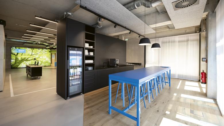 Der anschließende Schulungsbereich greift ebenfalls die zielgruppennahe Werkshallenatmosphäre auf. Die eigens entwickelten Arbeitstische und Materiallager sowie die integrierte Medientechnik ermöglichen die Vermittlung von theoretischem Hintergrundwissen und die praxisnahe Schulung. Die flexible Ausstattung lässt unterschiedlichste Nutzungen zu, wie Einzel- und Teamschulungen, Vorträge und Webinare sowie eine Bestuhlung für größere Gruppen.