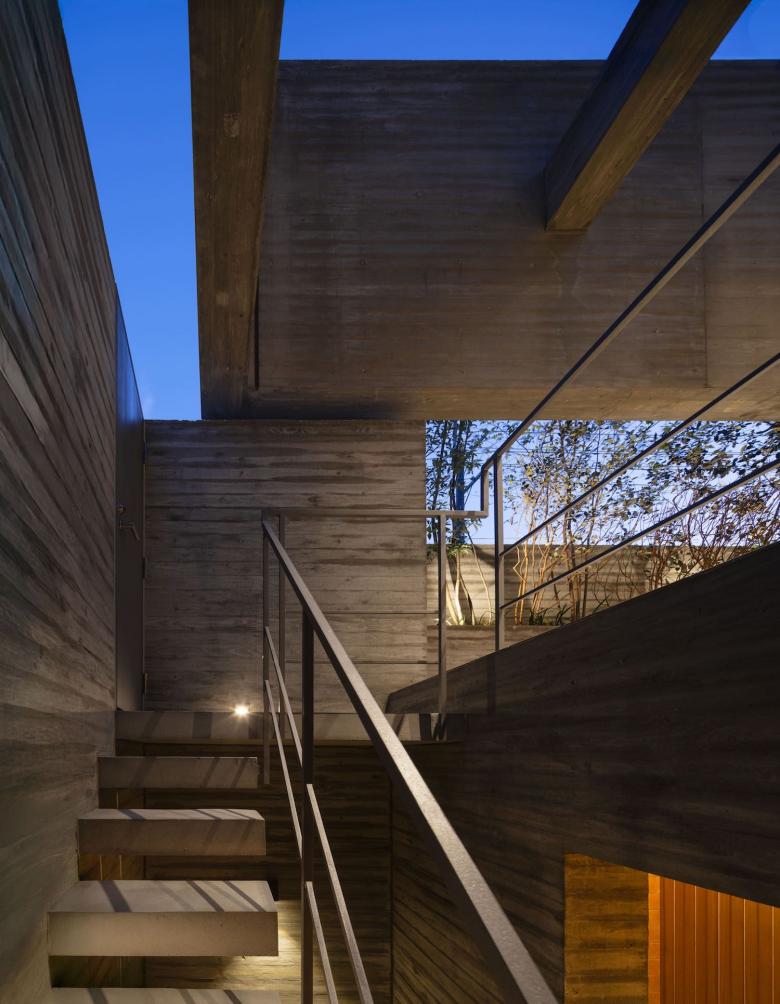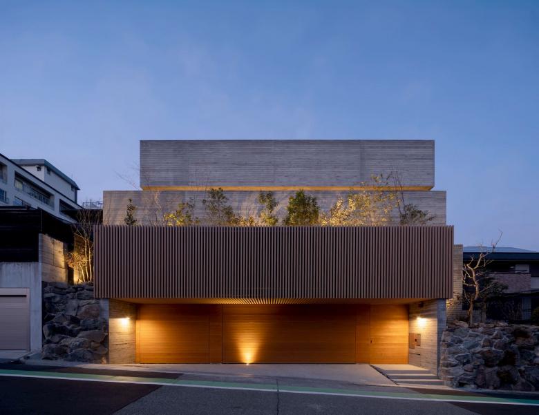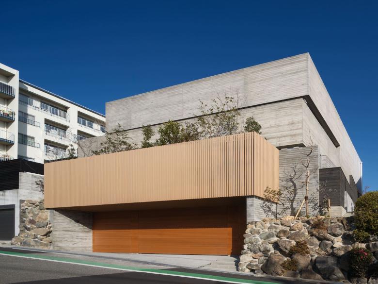 Externally, the three-storey structure is a box-shaped exposed concrete formwork. The basement level features uniform horizontal timber cladding from the gate to the garage. The first floor incorporates resin louvers covering the entire terrace parapet.From the second floor and roof slab, cantilevered beams support exposed concrete walls with cedar formwork, creating a floating screen.The unique exterior is formed by the interplay of three textures: the softness of wood, the delicacy of the louvers, and the solidity of the concrete, enhanced by the overflowing greenery from the terrace.