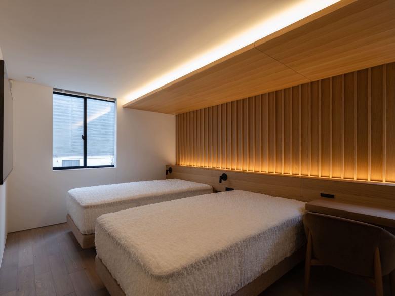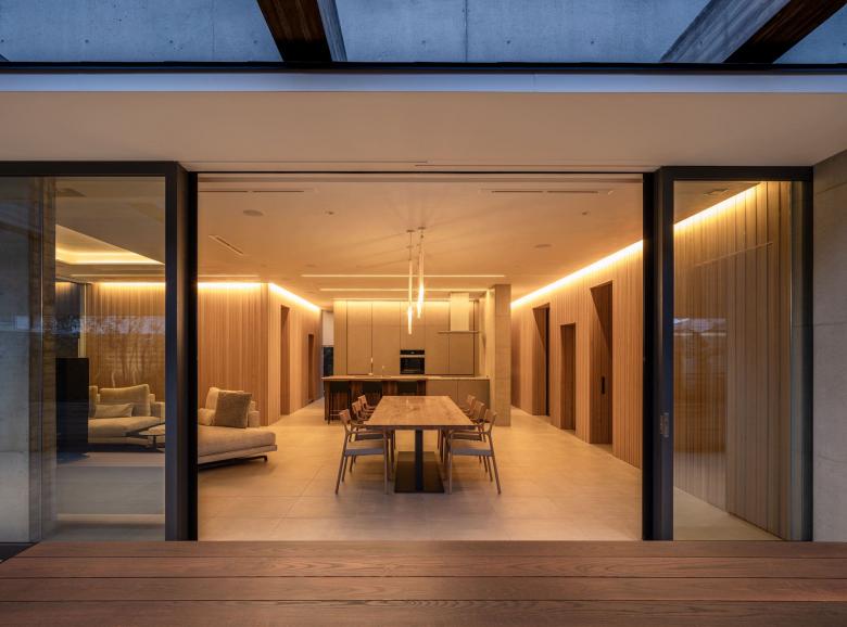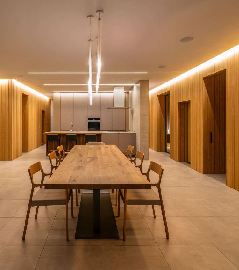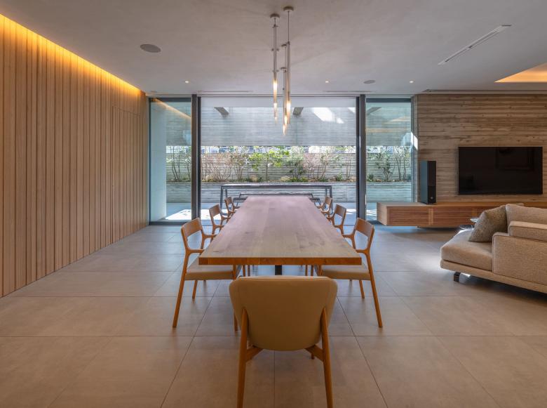 This project is a reinforced concrete structure comprising one basement level and two above-ground storeys. As the site's ground level is 4 metres higher than the front road, access to the building is via the basement.Both the approach and the entrance hall feature a double-height space, creating an open, light-filled atmosphere despite being underground.Upon entering the approach, a timber-clad wall appears. This wall continues upwards, traversing the first-floor living-dining-kitchen area and extending to the stairwell on the second floor.This timber cladding is installed with a distinctive textured pattern, creating varied expressions through the interplay of natural and artificial light. This approach preserves the warmth inherent in the wood while allowing each area to develop its own character, resulting in a richly textured space.