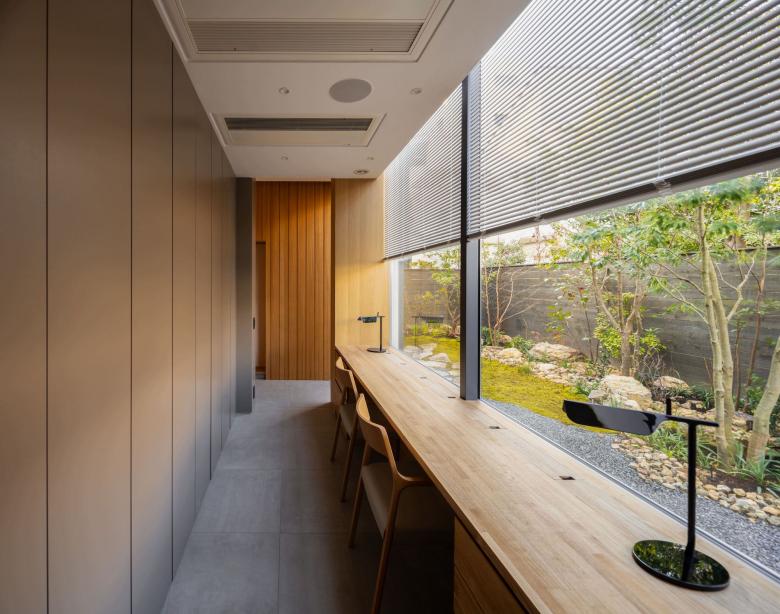 Bordered by the kitchen, the north side features a spacious living area contrasted by human-scale, tranquil spaces: a study and a Japanese-style room. These rooms offer views of the serene north garden.The design allows one to enjoy spatial variation by coexisting on the same floor a spacious communal area and the tranquil northern spaces.