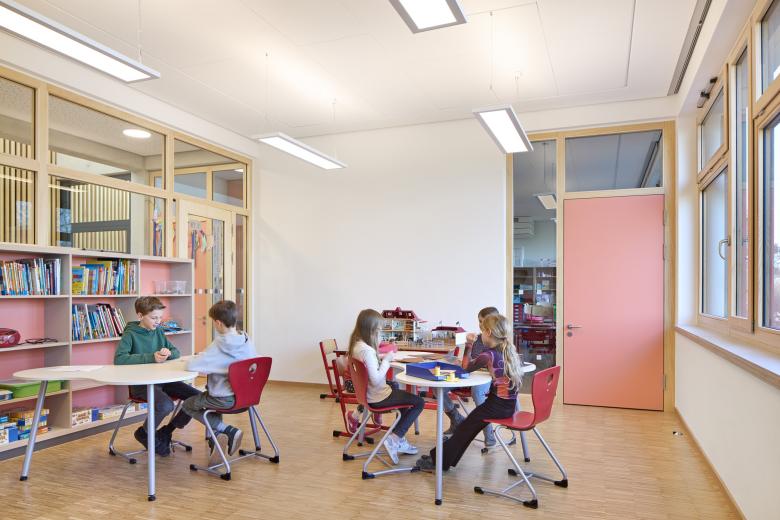 Die Klassenräume sind im Obergeschoss angeordnet und dort Teil einer offenen Lernlandschaft. Neben einer Gemeinschaftszone gibt es zwei Jahrgangsbereiche, die die Klassenräume über mittig liegende Freilernzonen zusammenschließen, die zur Gruppen- oder Einzelarbeit einladen.