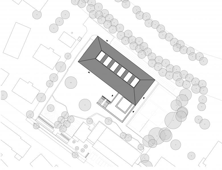 Über eine Treppenanlage, die als multifunktionale Tribüne dient, gelangt man in das Erdgeschoss, in dem neben der Verwaltung, Fachräume, die Ganztagsbetreuung und die Mensa angeordnet sind.