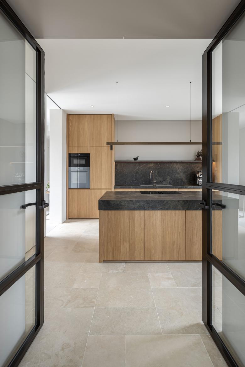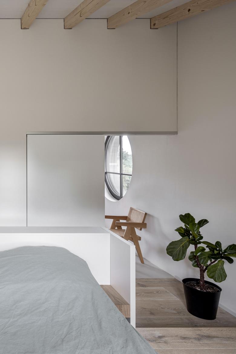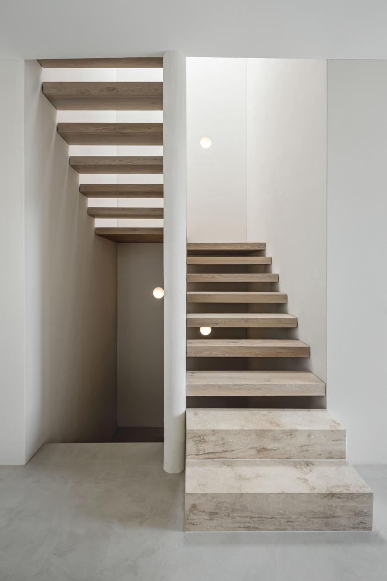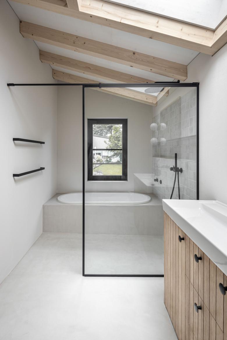 Die vertikale Erschließung des Hauses erfolgt über eine skulpturale U-Treppe, die das Gebäude über alle drei Geschosse hinweg durchstanzt. Der, den Eigentümern zuschaltbare Gästebereich erfährt eine Doppelnutzung und dient im Alltag als Büro und Gästebadezimmer.