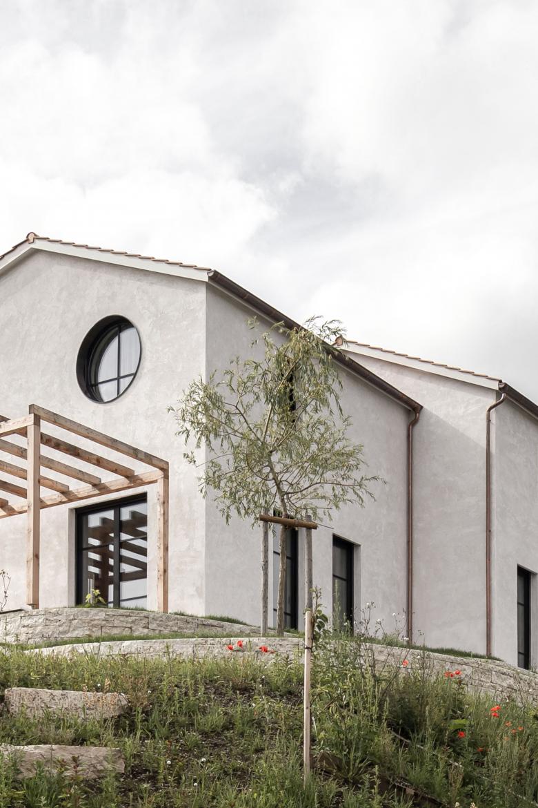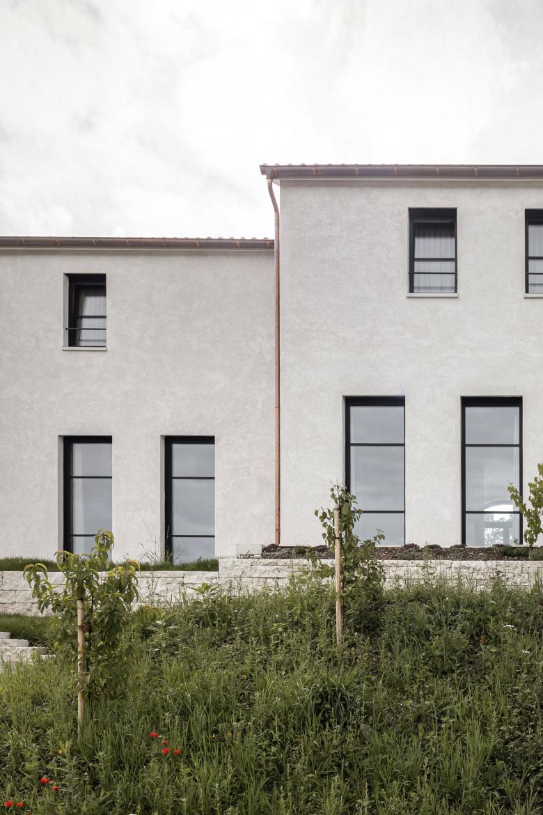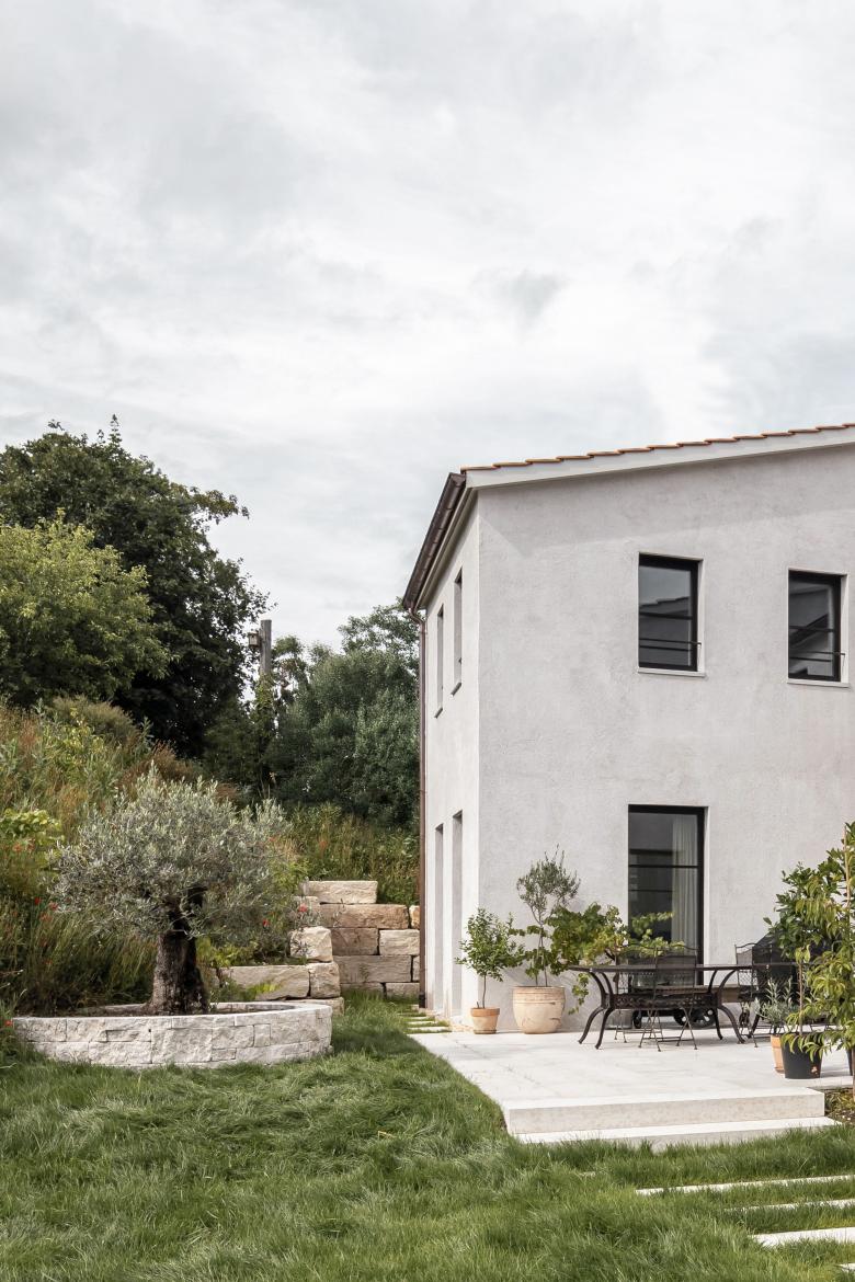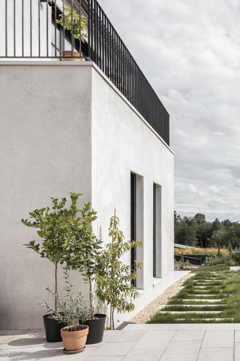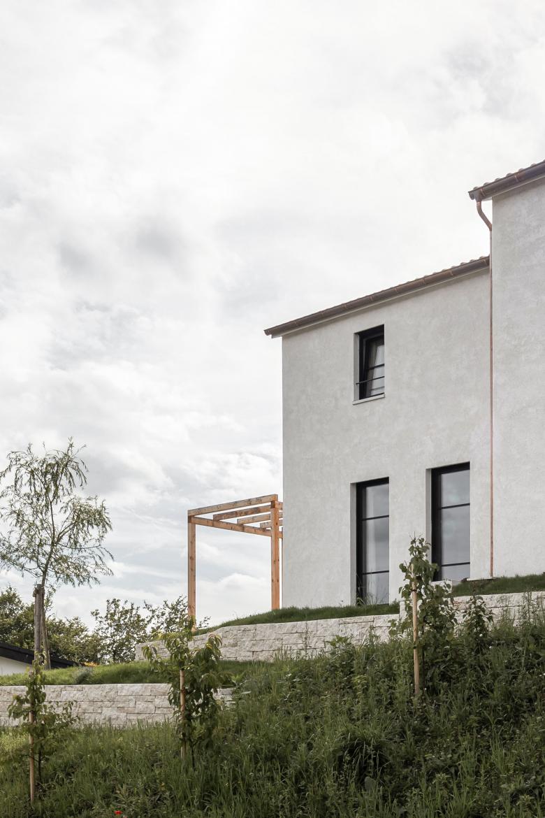 Die drei Baukörper gliedern die Parzelle in Aussenbereiche mit unterschiedlich gewählten Qualitäten. Im Fussabdruck entsteht durch das Versetzen der Volumen ein dreiseitig gefasster Innenhof, ausgerichtet nach Südwesten. Mit direktem Zugang dazu grenzen die Hauptwohnzonen Kochen, Essen, Wohnen und Entree im Erdgeschoss daran an. Für die Leidenschaft der Bewohner für Nutz- und Zierpflanzen entstehen so rund um das neue Heim mannigfaltige Bereiche für die verschiedenen Ansprüche der Pflanzenarten. Der schützende Hof bietet in den Sommermonaten angenehme Teilbeschattung und schafft ein passendes Mikroklima für den Aufenthalt im Freien.