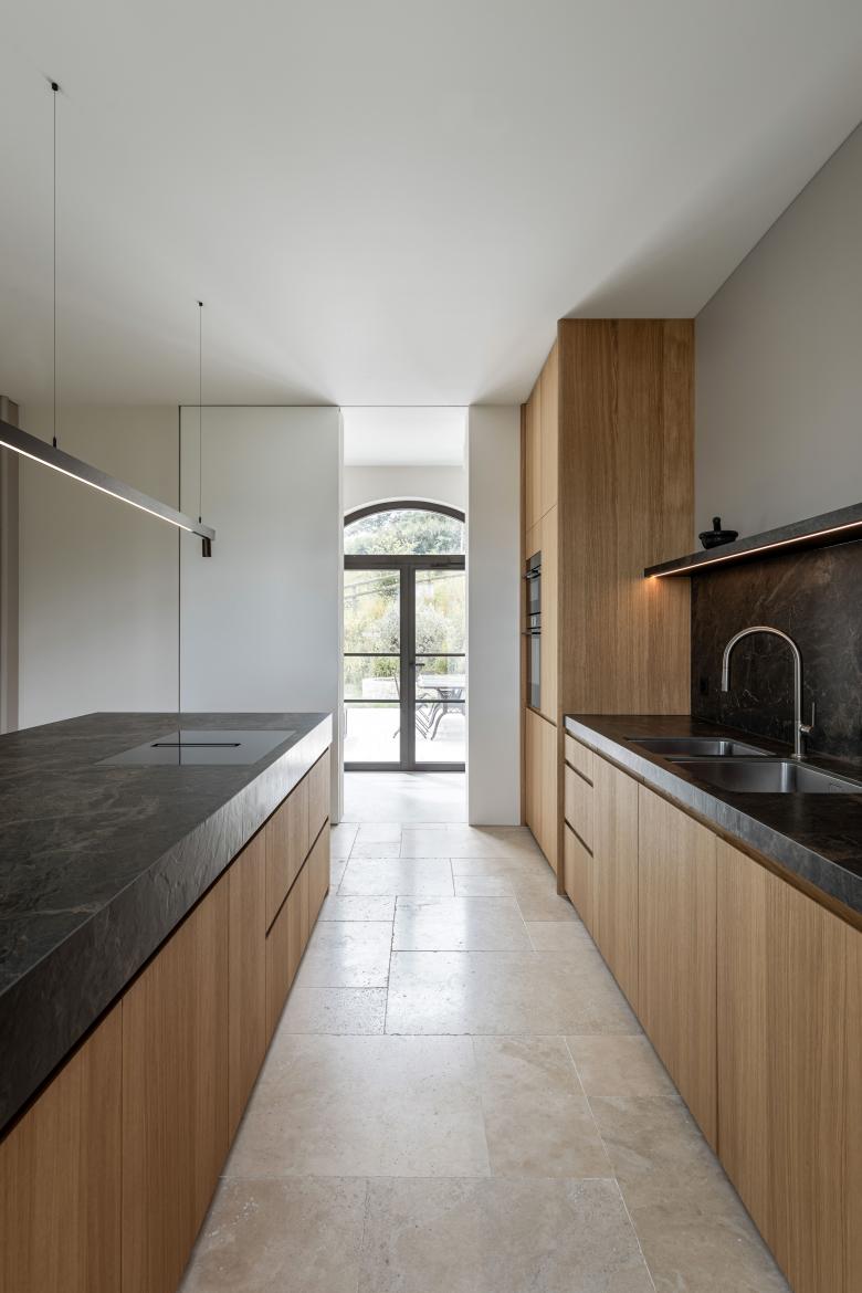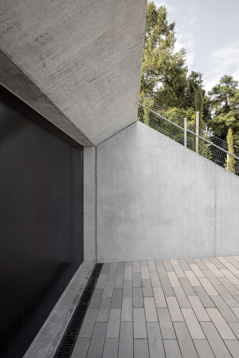 Die Weitläufigkeit der Parzelle ermöglicht einen architektonischen Entwurf mit Raumabfolgen wie man sie aus Gebäuden Mitte des 20. Jahrhunderts kennt. Jede Nutzung hat seinen eigenen Raum. Drei Wohn-Etagen schichten sich übereinander, wobei das Untergeschoss mit Nebenräumen, Fitness und Weinkeller aussenräumlich nur durch die Garageneinfahrt ablesbar ist. Dies vertikale Gliederung berücksichtigt die räumlichen und funktionalen Anforderungen, sowie die natürlichen Gegebenheiten und Qualitäten des Ortes. Der Entwurf folgt einer klaren Hierarchie: Auf dem Gartenniveau werden die offenen, lichtdurchfluteten und extrovertierten Räume angeordnet. Im oberen Geschoss befinden sich Schlafräume und privaten Nasszellen.