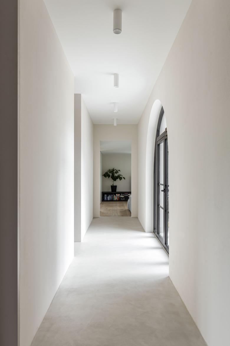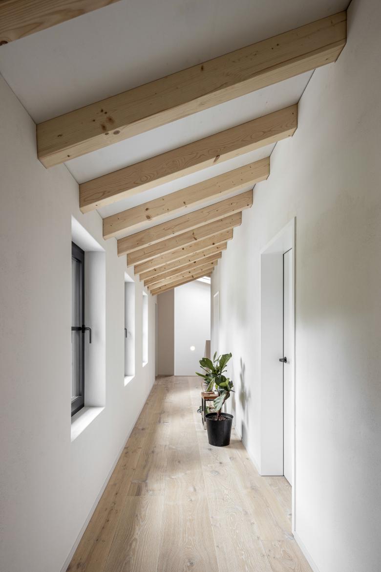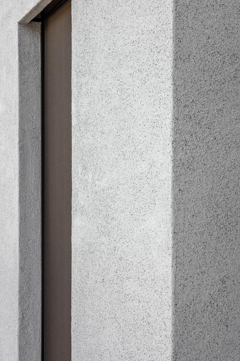 Das Konzept der drei, horizontal versetzten Baukörper wird in der Fassadengestaltung konsequent zu Ende gedacht. Die Veredelung des monolithischen Fassadensystems ist aussen mit einem mineralischen, eingefärbtem Waschputz gelöst, alle Innenwände sind mit Sumpfkalk abgerieben.