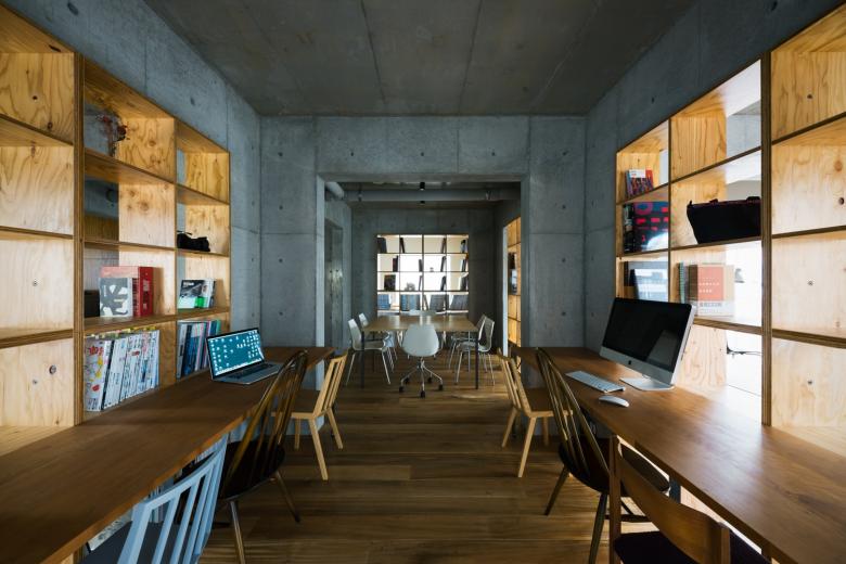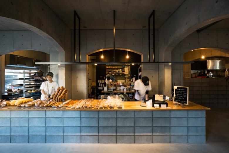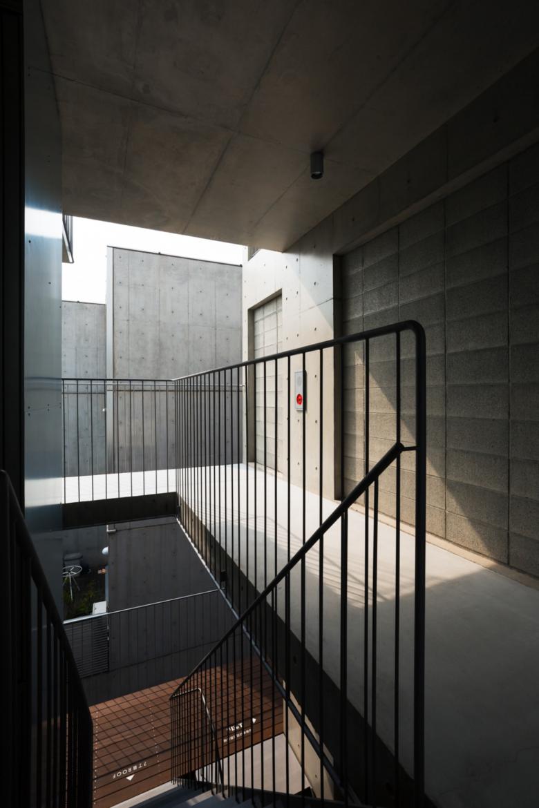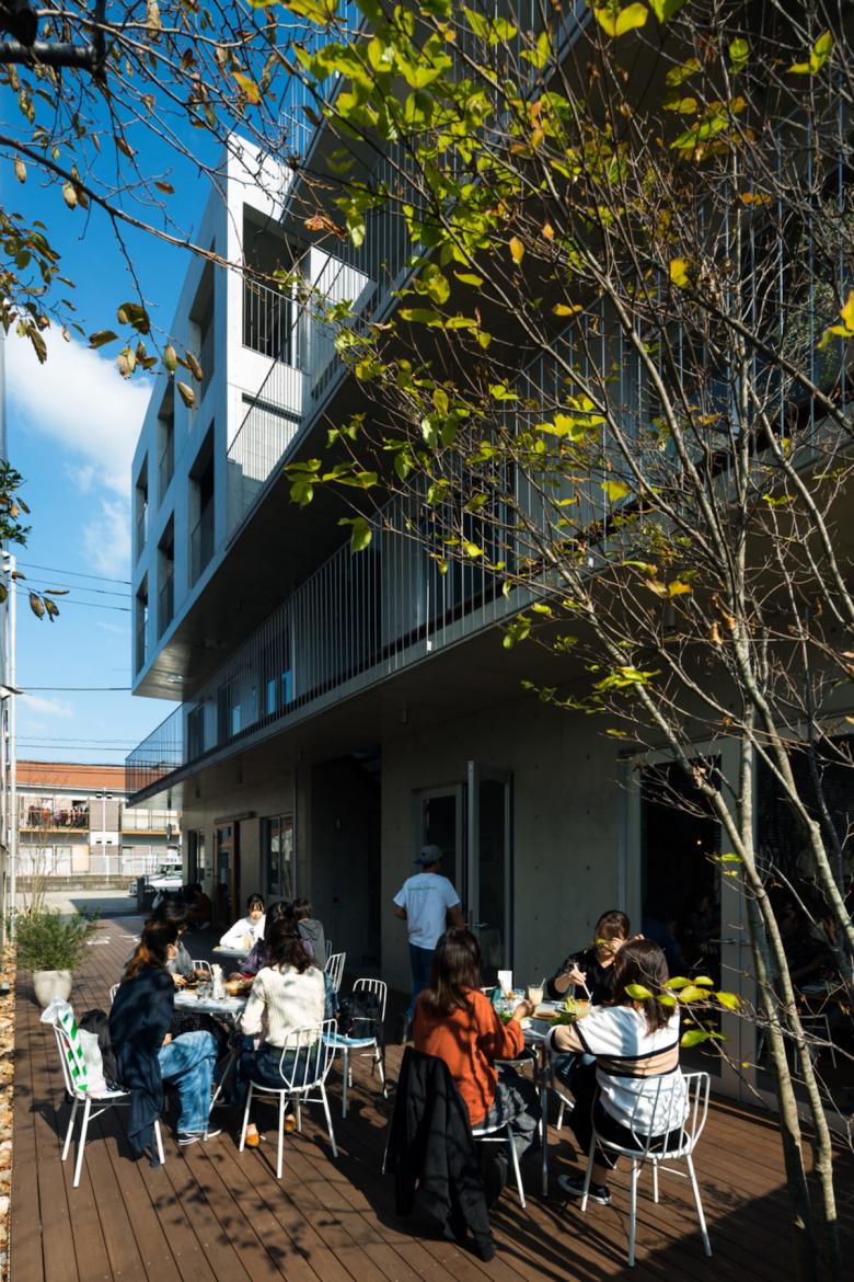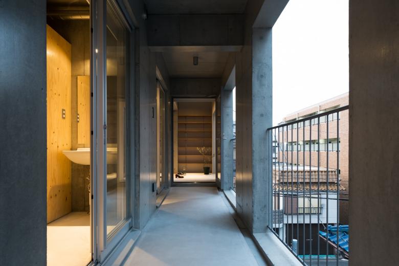 住人が住むだけの場ではなく、そこで働く人がいて、商う人がいる、外部の人々が集まれる複合的な機能を持った建物。1階のベーカリー&カフェ「gonno bakery market」が面するのは、2000年に建てられた「西葛西APARTMENTS」との境に設けたオープンペース「7丁目PLACE」。2階はコワーキングスペース「FAR EAST of TOKYO」と駒田建築設計事務所、3,4階に賃貸住戸という構成です。