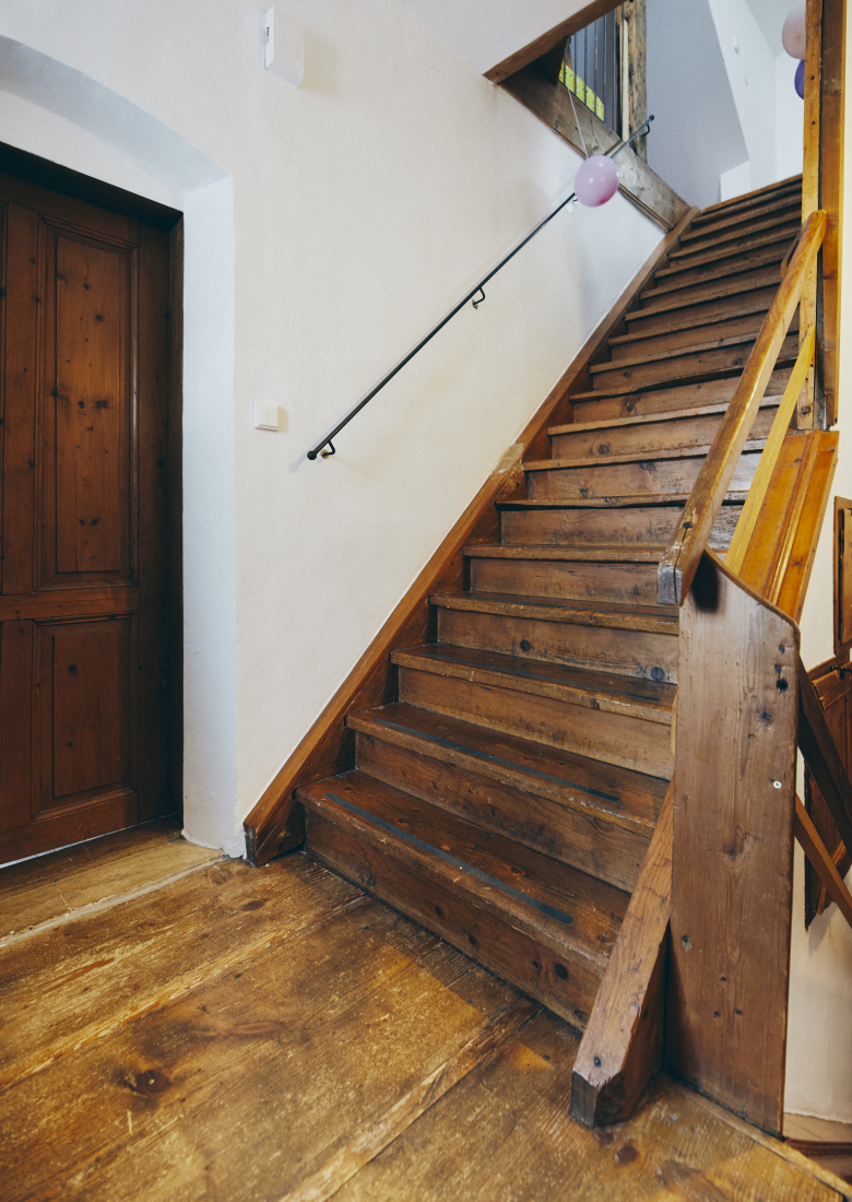 Über eine bestehende alte „knarrende Holztreppe“ kommt der Besucher vom Galerieraum des Kunstaltier in den privaten Bereich. Leben und arbeiten vereint sich auf einen Ort. Der Wohnraum ist über dem Galerieraum platziert. Durch das Öffnen des Wohnraumes an der West Hauswand wird ein opulenter Ausblick in die Landschaft generiert. Das Fenster wird dabei zum Bilderrahmen und die statische Verstärkung bewusst in Szene gesetzt.