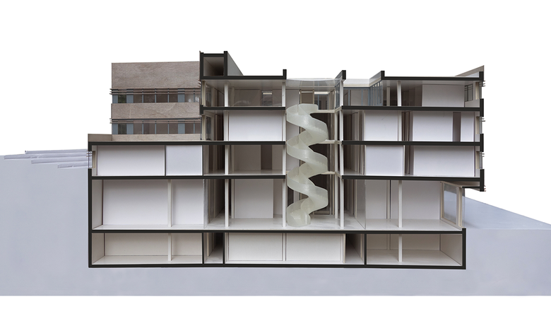 Der kompakte, flächige Baukörper wird durch Einschnitte, Höfe und Atrien gegliedert und bildet eine Begegnungslandschaft im Inneren der äusseren Nutzschicht mit Labors und Produktionsräumen. Das Atrium mit der charakteristischen Helixtreppe leitet von der Hauptachse ins Gebäude und verbindet alle Abteilungen in den Geschossen.