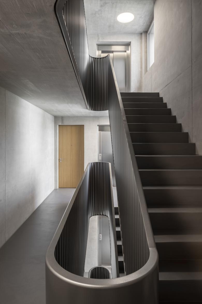 Das Mehrfamilienhaus beherbergt 9 Wohnungen auf drei Vollgeschossen und einem Attikageschoss. Im Untergeschoss befinden sich die Autoeinstellhalle, die nötigen Keller- und Technikräume sowie ein Veloraum. Ein natürlich belichtetes Treppenhaus im Gelenk des Gebäudes erschliesst je drei Wohnungen pro Geschoss sowie die Attikawohnung. Das grosszügige abgerundete Treppenauge verleiht dem Gebäude ein Zentrum mit starker visueller Wirkung und hoher Identifikation. Die Wohnungen sind kompakt organisiert, die Gänge mit anliegenden Zimmern führen in den offenen Wohn- und Essbereich, der sich über die gedeckten Balkone und Sitzplätze zum Aussenraum hin öffnet. Die Gebäudeform erlaubt dabei eine individuelle Ausrichtung der Wohnungen nach verschiedenen Richtungen.