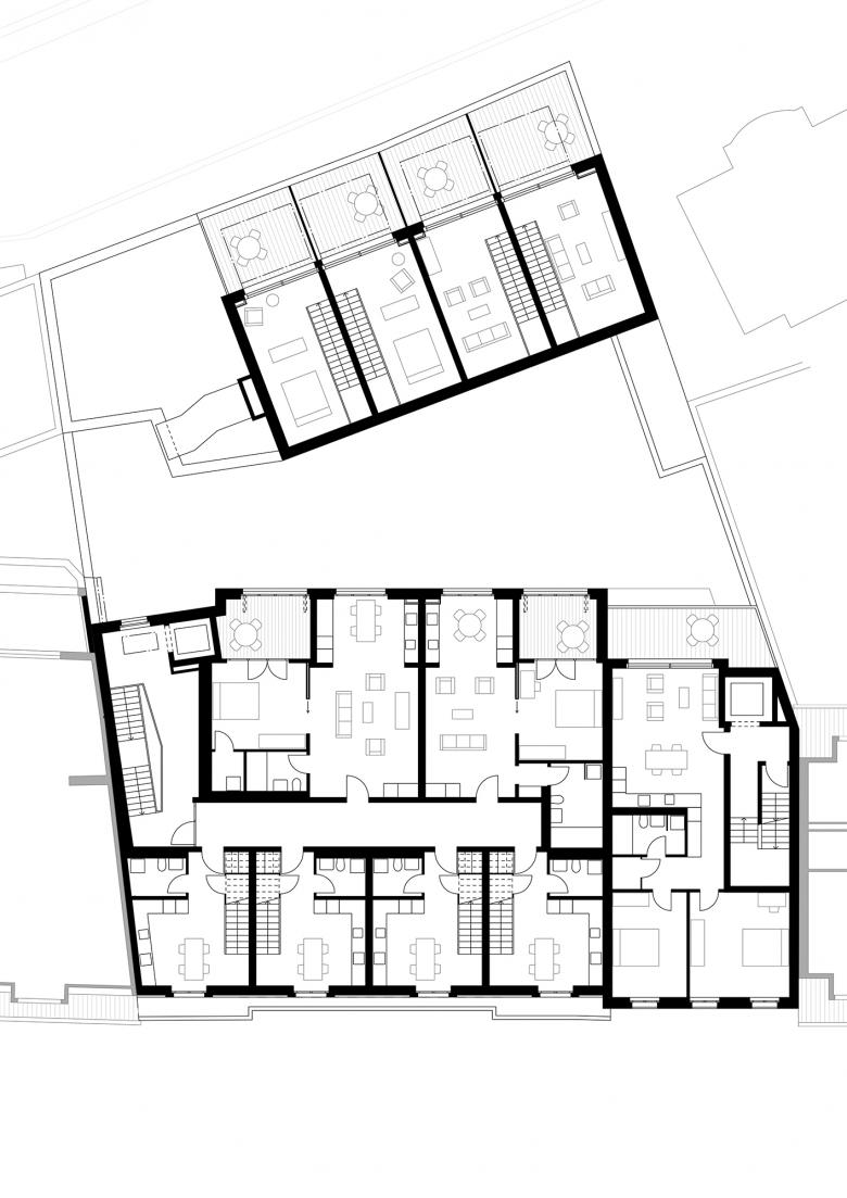 Im 1. Obergeschoss ist eine zukünftige Büronutzungen vorgesehen, im 2. Obergeschoss erstreckt sich strassenseitig eine grosszüge Wohnung im Charme der Altbausubstanz. Hofseitig und im Bereich der Aufstockung sind Wohnungen unterschiedlicher Grösse anzutreffen. Vier Maisonettewohnungen nutzen die Westorientierung zur Badstrasse und die Terrassenausicht im Attika Richtung Schartenfels.