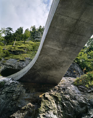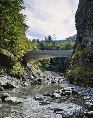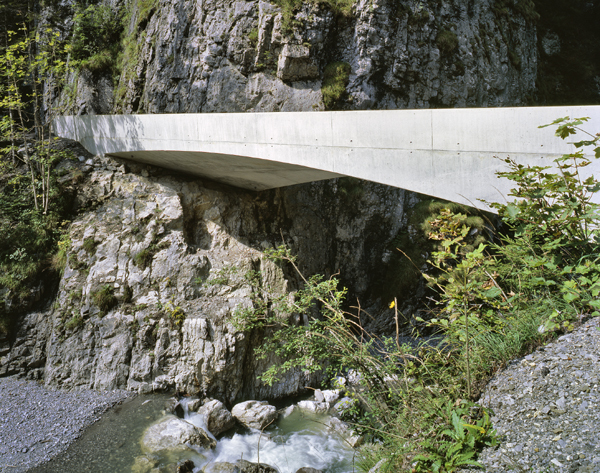 Gedacht aus der Typologie der Steinbogenbrücke ist sie das Ergebnis einer Ausreizung der Bogenform mit modernen Technologien. Um der Unterforderung des Stahlbetons entgegen zu wirken, wurde der Bogen auf ein statisches Minimum reduziert und zusätzlich einer Verwindung unterzogen. Diese reagiert auch auf den beidseitig in Krümmung wegziehenden Straßenverlauf und wird so zur betonierten Skulptur. So unspektakulär die Brücke sich in der Draufsicht oder der Perspektive des Fahrers ausnimmt, so faszinierend präsentiert sie sich vom Ufer der sich durch die Klamm windenden Ache: spielerisch mimt sie die gefrorene Dynamik der Bergstrecke und macht die Dramatik des Ortes in Stahlbeton manifest. Formvollendete Ingenieur- und Gestalterleistung präzise eingespannt in das umliegende Naturspektakel.