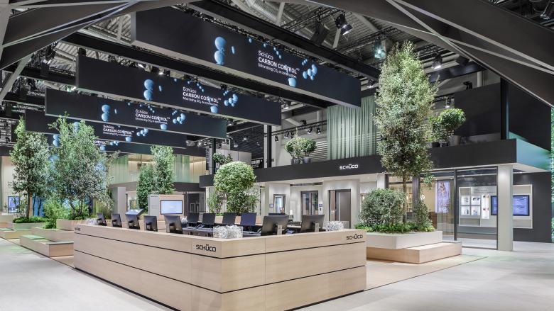 Zahlreiche Maßnahmen sind zur deutlichen CO2 Reduktion und CO2 Kompensation des Schüco Messestandes BAU 2023 umgesetzt worden: