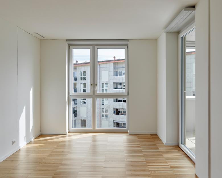 Der vorgeschlagene Wohnungstyp mit der abtrennbaren Wohnküche ist aus der städtebaulichen Setzung entwickelt und unterstreicht die Schlankheit der Gebäudezeilen. Er vereint die Qualitäten des «Durchwohnens» mit den praktischen Vorzügen einer abschliessbaren Küche. Das Wohnzimmer mit den Balkonen liegt jeweils, alternierend in jeder Zeile, auf der Seite des weiteren Aussenraums. Die Hauszugänge befinden sich an der Stirnseite und in der Mitte der Zeile. Die geringfügigen Versätze in den Fassaden ermöglichen jeder Wohnung neben der primären Ost- und Westorientierung auch einen Blick nach Norden und Süden in die Tiefe des Aussenraums und zu den angrenzenden Baufeldern.