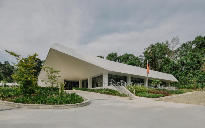 Das 1984 erbaute Kanzleigebäude präsentiert sich als flacher Bungalow inmitten einer parkähnlichen Landschaft am Rande von Singapur. Ein respektvoller Umgang mit dem Bestand führte zu minimalinvasiven Lösungen. Die quadratische Form des Baukörpers wurde vervollständigt und durch eine Erweiterung der Gebäudehülle nach aussen optimiert. Die bisher offene Ecke am Haupteingang wurde ergänzt und die Aussenfassade um einen Meter nach aussen verschoben, um damit Raum für Aufenthaltszonen und eine Verdreifachung der Arbeitsplätze zu schaffen. Die neue Tragstruktur ist auf wenige präzise Massnahmen beschränkt, die sich sowohl am Bestand orientieren als auch die neue räumliche Gliederung wesentlich prägen. Ein separater, gläserner Konferenzraum wurde im Bereich des Eingangs neu geschaffen. Neben diesem Körper bleibt ein überdachter Eingangsbereich vor den Eingängen frei. Dieser Ankunftsbereich ist als leicht erhöhte Plattform gestaltet, die einen Ausblick ins umgebende Grün bietet. Das darüber liegende Dach ist zur Ecke hin leicht angehoben – eine einladende Geste – die für die Offenheit und Transparenz des Landes stehen.