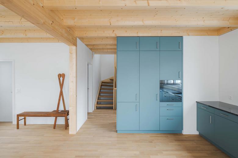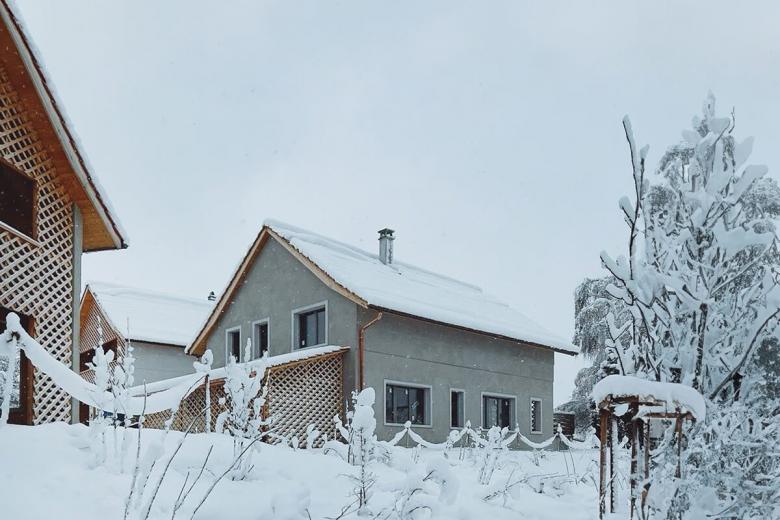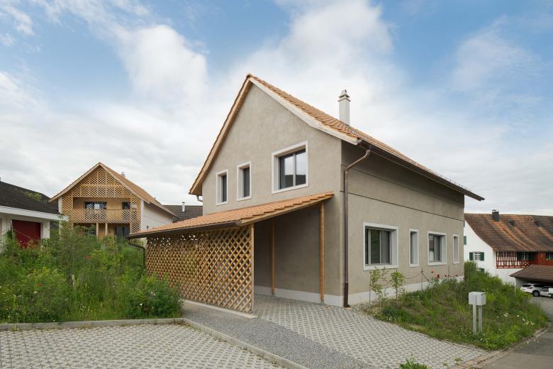 Umfasst werden die Häuser von einem Einsteinmauerwerk (Ziegelstein mit Lufteinschlüssen), und einem dicken Kalkputz. Förmlich in das Mauerwerk hinein ist ein Holzbau gesetzt. Die Anordnung der Volumen, die Materialisierung mit Kalk und Holz und einem langsam wachsendem Naturgarten ergeben ein stimmungsvolles Gesamtbild in der ISOS geschützten Dorfzone von Nussbaumen.