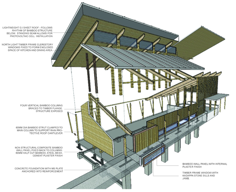 One could explore the concept of land (farming) to hand (Harvesting/ tilling) to mouth (consuming) experience for food. The site was to house a maximum of 50 persons and the aim was to manage within the footprint (ecological) of the site. The project uses alternative building materials of (bamboo and wood composites) to create an architecture i.e. at once enduring to the landscape and the surrounding environment at the same time dramatically cutting the embodied energy of the building materials. The Bhramasthan (meditation centre) is the focus of the Plan set amidst farming lands. The campus aims at a self sustaining life where food, water and energy are all close loops within the campus itself.