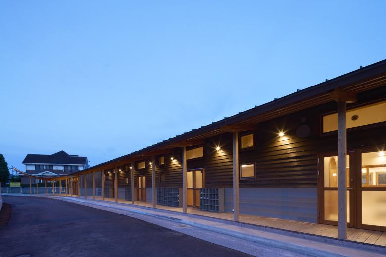 Since the new kindergarten building has a wide frontage along the frontal road, it is divided into a hall building and a classroom building, and between the two buildings is a passage to the backyard. Backyard not really back in a sense that it faces the south, enjoys sunshine and a great view to the surrounding mountains. It is spacious enough for not only daily outdoor play but also a sports festival with participation of families and friends. This space is called “garden”.