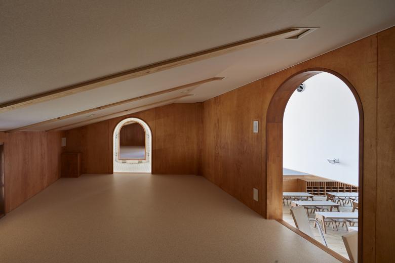 When the sliding doors of nursery rooms are closed, the expansion space becomes a small hall like area. The ceiling was set high to incorporate lofts where children can play, and a wide wall was set up so that various works by children could be exhibited. Even if the hall building is rented out, the classroom building is flexible enough to hold an event of a certain scale.