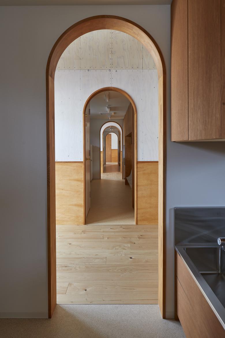 For the fittings, the glass is divided in the middle from the waist height, below the waist is cloudy film finish so that the children are not distracted and above the waist is transparent to secure good view. The wall cloth in the nursery room has different patterns depending on the age, and the flooring has different joints and orientations for each zone. By giving various changes and switch from large scale to small scale, adults and children alike could have their own attraction and attachment to the space.